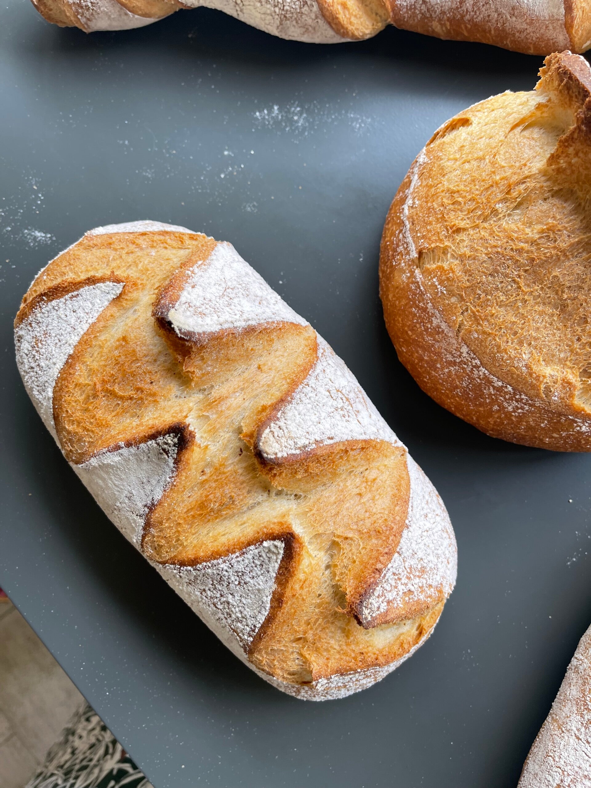 Pain au levain : Ce pain est fabriqué en utilisant un levain naturel plutôt que de la levure commerciale. Il a une mie dense et une saveur légèrement acidulée.