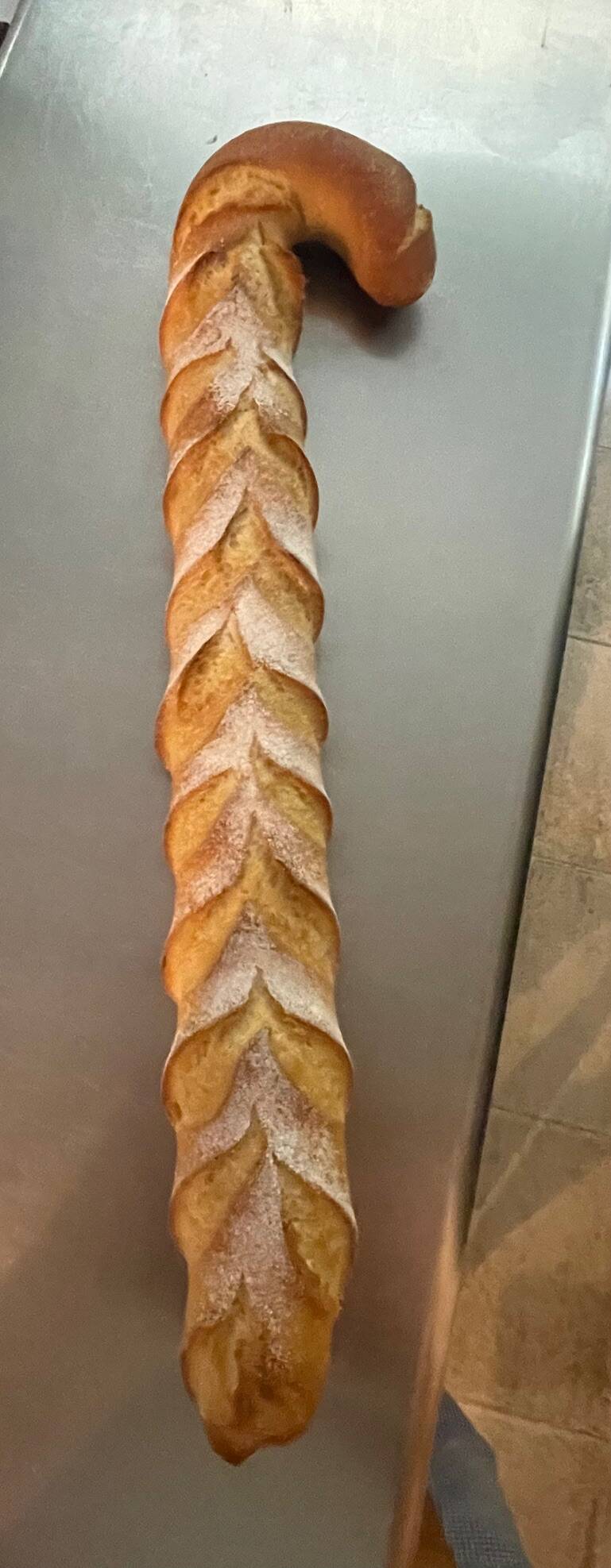 La baguette Saint-Éloi est une variante spécifique de la baguette traditionnelle française, qui tire son nom de la rue Saint-Éloi à Paris, où elle était populaire. Cette baguette se distingue par sa forme allongée et fine, sa croûte dorée et croustillante, ainsi que sa mie tendre et alvéolée. La baguette Saint-Éloi est réputée pour son goût délicat et sa texture légère, ce qui en fait un choix apprécié pour accompagner les repas ou pour être dégustée seule avec du beurre frais ou des confitures. Son processus de fabrication peut varier légèrement selon les boulangeries, mais elle est généralement réalisée à partir de farine de blé de qualité, d'eau, de levure et de sel, suivant une méthode de fermentation et de pétrissage minutieuse. Cette baguette est souvent associée à l'art traditionnel de la boulangerie française et est appréciée pour son goût authentique et son caractère artisanal.